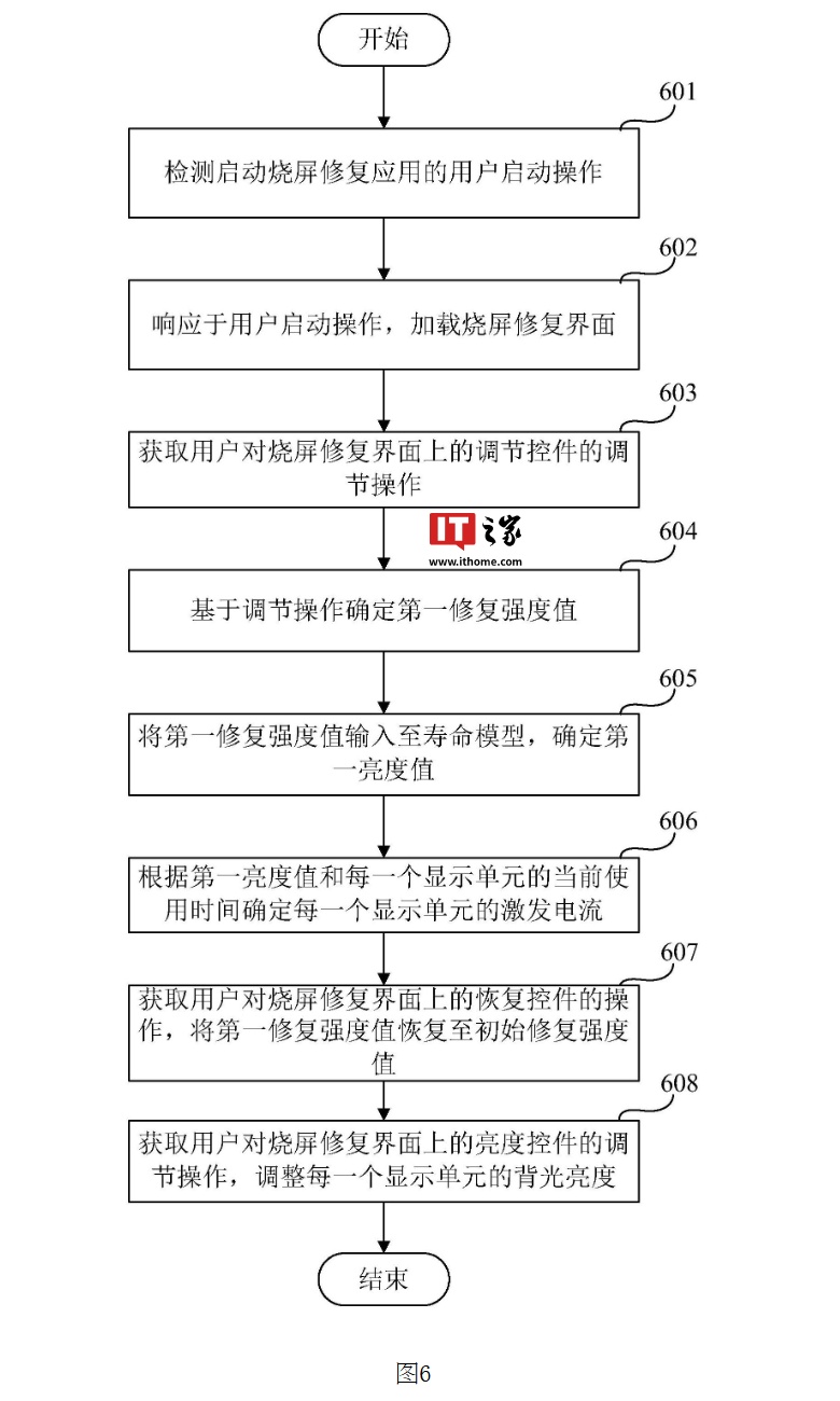 用户在调节屏幕亮度后,系统会检测用户操作并确定目标亮度,系统会根据目标亮度,分别为烧屏区域内外的发光元件设置不同的激发电流值,通过这种差异化的电流控制,最终让整个屏幕的亮度达到一致,从而修复烧屏。